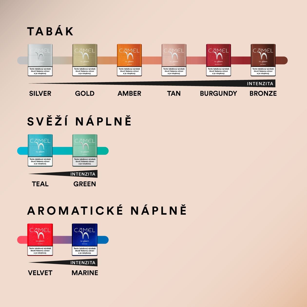 S nabídkou Camel náplní – od klasického tabáku v různých intenzitách až po jedinečný zážitek ze svěžích nebo aromatických příchutí – si určitě najdete své oblíbence.